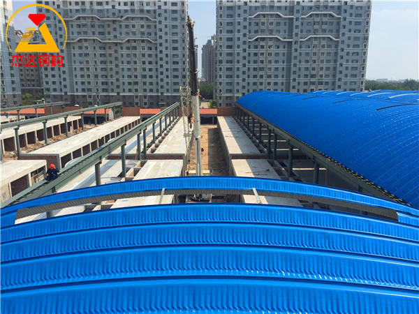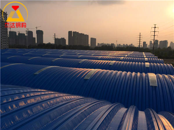 施工前需定制專用的拱形屋頂采光帶,確保尺寸和曲率精準匹配。組裝過程中,在每榀拱形屋頂中部安裝兩道角鋼支撐,提高結構穩定性。