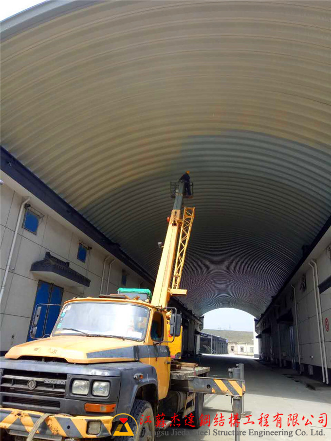 本工程為江蘇揚州市邗江區公道糧庫拱形屋頂倉間罩棚制作安裝,施工周期短,質量可靠,滿足倉儲功能需求。