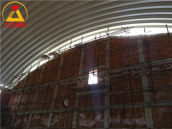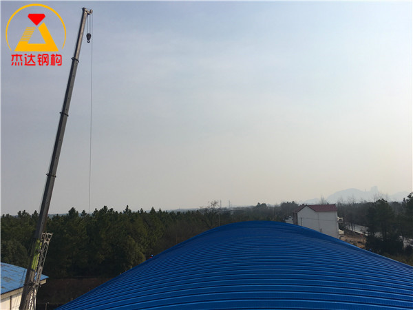 屋面板的制作及安裝是項(xiàng)目的關(guān)鍵步驟。彩涂卷板通過專業(yè)設(shè)備壓制成型,保證尺寸精確與表面平整。組裝環(huán)節(jié)嚴(yán)格按照設(shè)計(jì)圖紙進(jìn)行,確保拱形屋頂整體形態(tài)符合施工要求。吊裝過程中,施工人員配合有序,采用安全的吊裝方案,保障吊裝作業(yè)的高效與安全。
