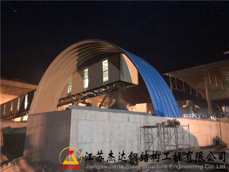 該拱形屋頂跨度約為19米,拱高8米,采用1.2mm厚的鋼板作為屋頂板材,下部連接板厚度為10mm。屋頂結(jié)構(gòu)比例協(xié)調(diào),拱高接近跨度的一半,造型優(yōu)雅,符合礦區(qū)環(huán)境需求。