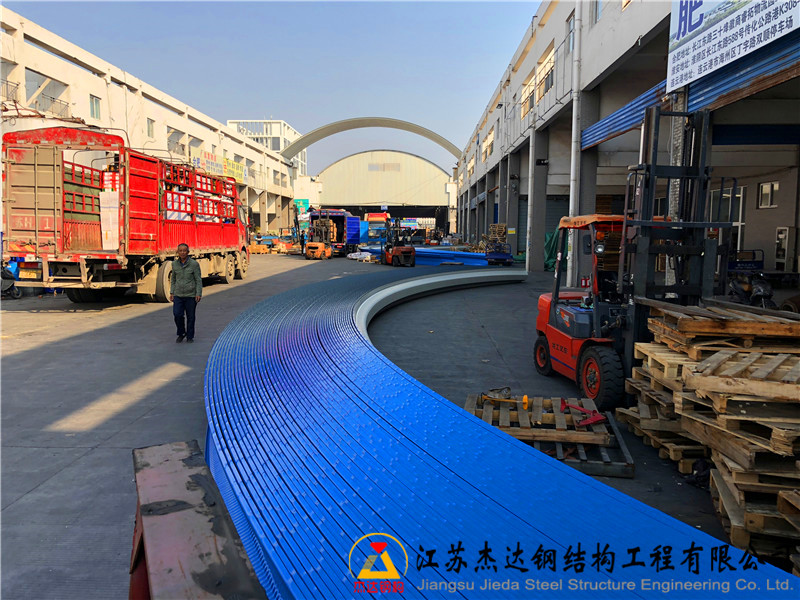 本工程位于安徽省合肥市肥東縣睿拓物流園,主要對園區內的拱形屋頂進行改造。屋頂跨度為24米,長度達110米,矢跨比為1:5,拱高4.8米。采用上海寶鋼1.2毫米厚的彩涂卷材制作拱形屋頂。施工過程中,拆除了原有的拱形屋頂,其中三棟建筑進行了全新搭建,先焊接拖板,再整體安裝新屋頂。兩棟建筑則拆卸后重新吊裝,并將托板更換為長度35厘米、厚8毫米的鐵板。