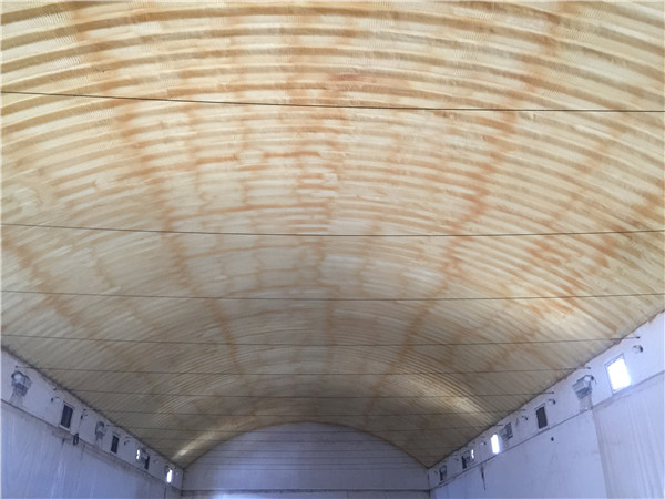 糧庫拱形屋頂施工完成吊裝后,通常會進(jìn)行聚氨酯噴涂,以提升保溫效果和防護(hù)性能。